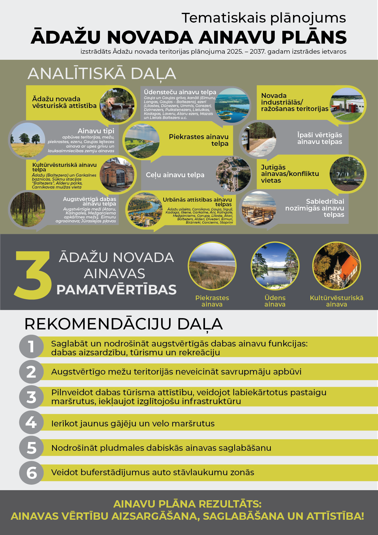 Teritorijas plānojuma izstrādes ietvaros izstrādāti un apstiprināti divi tematiskie plānojumi – Ādažu novada ainavu plāns (pieejams portālā Ģeolatvija.lv: https://geolatvija.lv/geo/tapis#document_30131#nozoom) un Ādažu novada transporta attīstības plāns (pieejams portālā Ģeolatvija.lv: https://geolatvija.lv/geo/tapis#document_32060#nozoom). Ainavu plāna izstrādes laikā 22.11.2023. notika diskusija ar iedzīvotājiem par ainavu vērtībām.