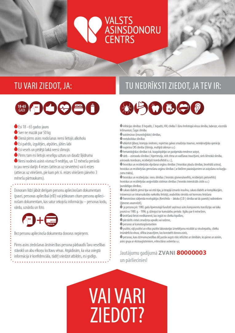 VADC gaida visus veselus donorus, kuri ir pārliecināti par savu veselības stāvokli un var ziedot asinis. Pēc starptautiskajām rekomendācijām, asins ziedošana nav uzskatāma par masu pulcēšanās pasākumu, bet ir atbalstāma un veicināma arī šajā sarežģītajā laikā.