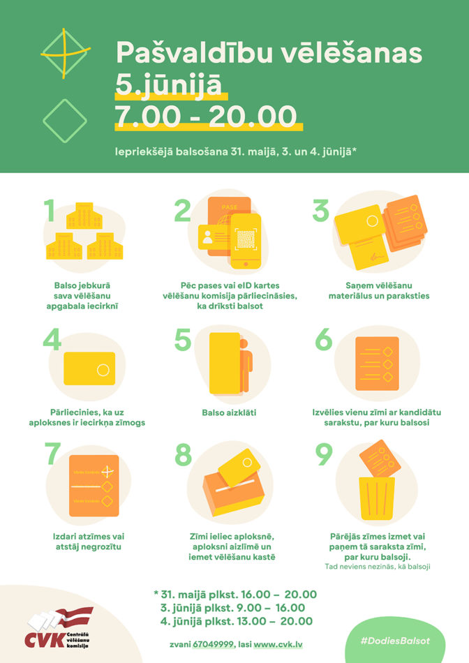 | Sestdiena, 5. jūnijs | 7.00. – 20.00. | Vēlēšanu diena |
