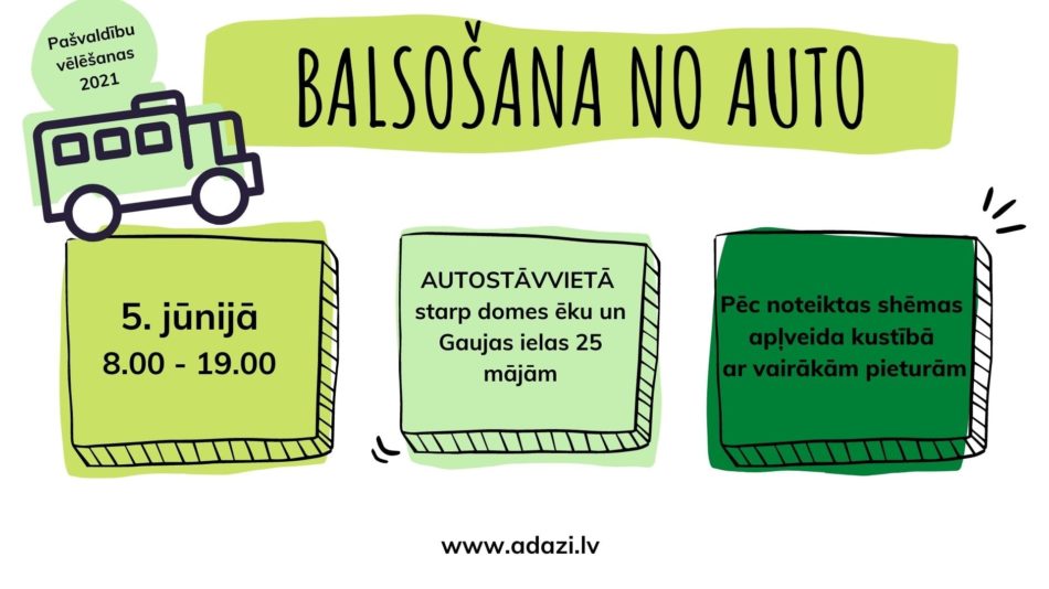 Ādažu novadā 5. jūnijā no 8.00 līdz 19.00 būs iespējams nobalsot arī no savas automašīnas – autostāvvietā pie Ādažu novada domes ēkas (starp domes ēku un Gaujas ielas 25 mājām). Tādējādi vēlētājiem tiks piedāvātas plašākas balsošanas iespējas gadījumā, ja vēlētājs Covid-19 dēļ nevēlas balsot iecirkņa telpās un būt saskarsmē ar citiem iecirkņa apmeklētājiem. Vienlaikus jāuzsver, ka Latvijā šī iespēja neattieksies uz vēlētājiem, kuri ir pašizolācijā vai mājas karantīnā saistībā ar Covid-19. Šiem vēlētājiem jāturpina ievērot epidemioloģiskie drošības pasākumi un jāpiesaka balsošana savā atrašanās vietā.