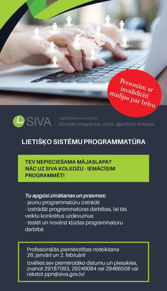 Sociālās integrācijas valsts aģentūra aicina uz ziemas uzņemšanu SIVA Koledžas studiju programmās:
