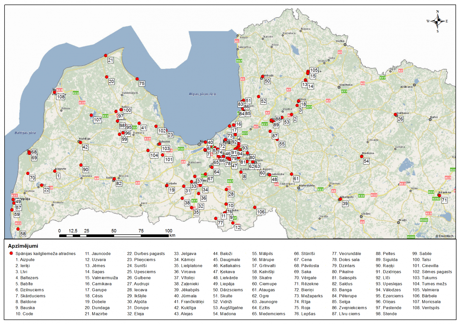 Līdz 2021. gadam ir apstiprinātas 108 sugas atradnes, tai skaitā Baltezerā. Karte elektroniski skatāma.