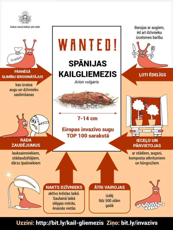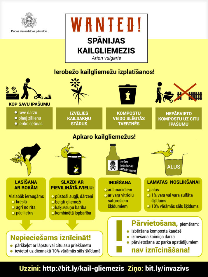 Aicinām iedzīvotājus iepazīties ar Dabas aizsardzības pārvaldes veidotajiem informatīvajiem materiāliem, lai izprastu Spānijas kailgliemeža iespējamo ietekmi, tā izplatības ierobežošanas metodēm un veicinātu ierobežošanas pasākumu veikšanu: