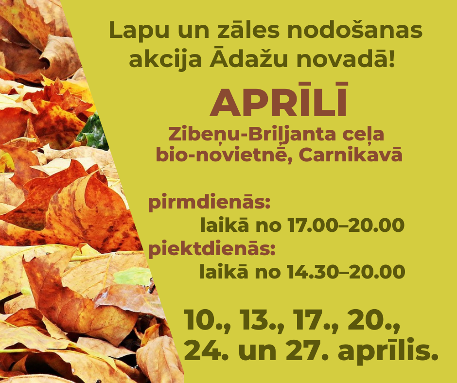 - Akcija paredzēta Ādažu novadā deklarētajiem iedzīvotājiem un zemes īpašniekiem, uzrādot personu apliecinošu dokumentu. Dārza atkritumus pieņems P/A “Carnikavas Komunālserviss” darbinieks.