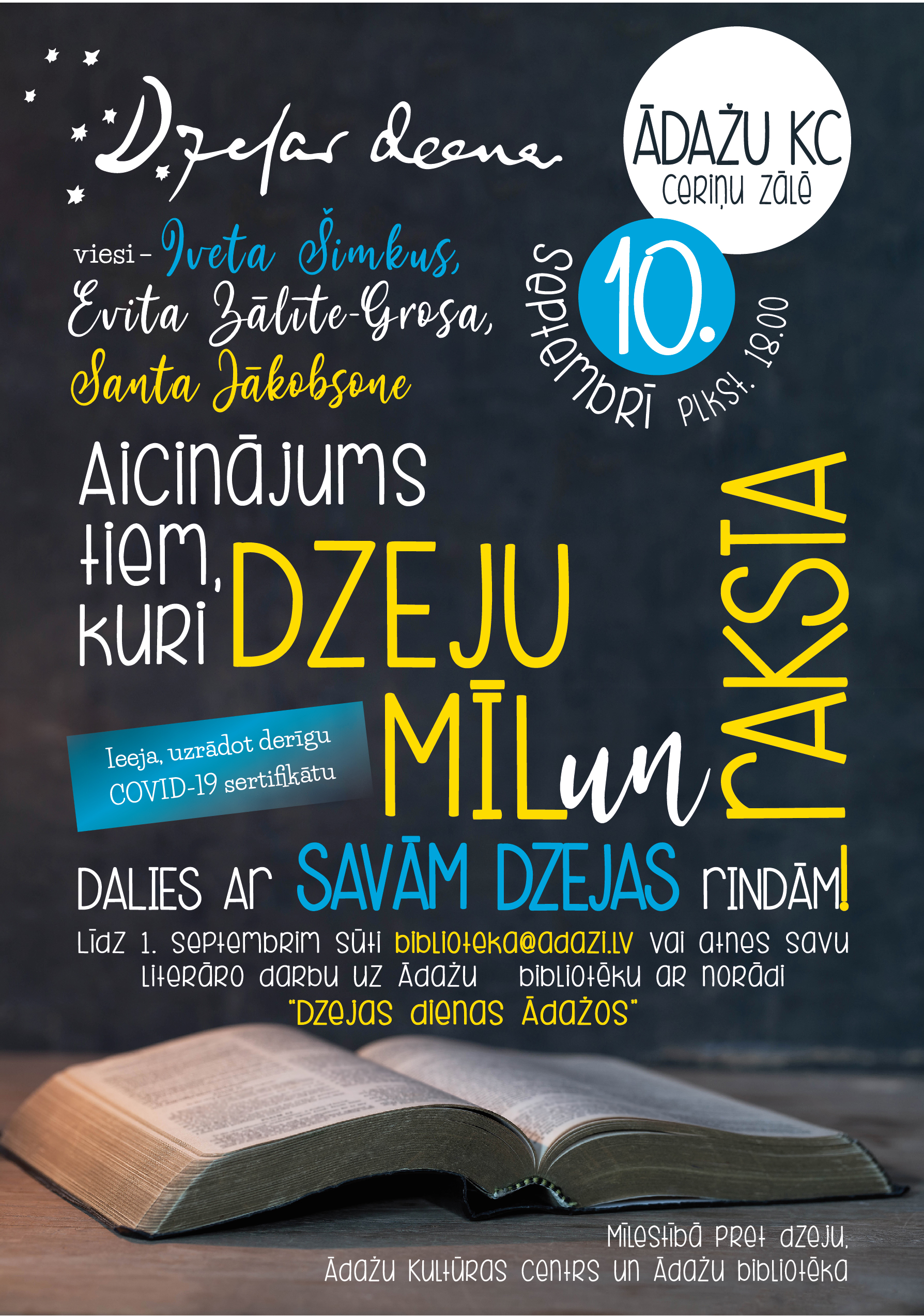 Ādažu novada bibliotēka un Ādažu Kultūras centrs aicina dalīties ar savām dzejas rindām un līdz 1.septembrim iesūtīt tās uz e-pasta adresi: biblioteka@adazi.lv! Dzejas dienās Ādažos 10.septembrī plkst.18.00 Ādažu Kultūras centra Ceriņu zālē, Gaujas ielā 33A, Ādažos, būs iespēja satikt talantīgas un iedvesmojošas personības – Evitu Zālīti-Grosu, Ivetu Šimkus, Santu Jākobsoni, klausīties dzejas lasījumos, atklāt jaunus talantus dzejā, kā arī baudīt sirsnīgu gaisotni!