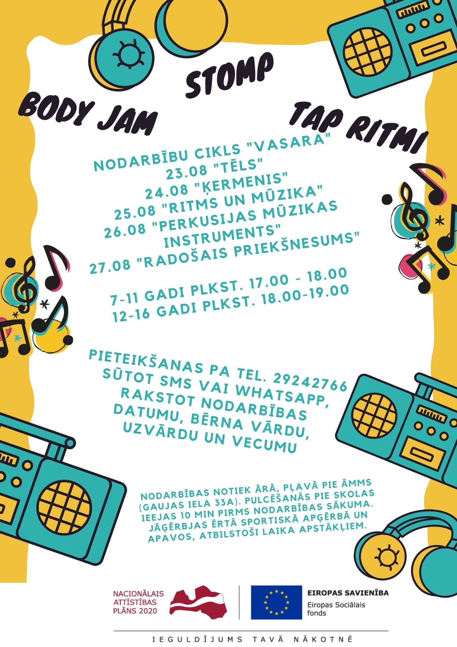 Par nedēļu pārcelts Eiropas Sociālā fonda projekta “Pasākumi vietējās sabiedrības veselības veicināšanai Ādažu novadā” (Projekta) deju nodarbību augusta cikls “Body Jam, Stomp un Tap ritmi” bērniem un jauniešiem divās vecuma grupās: no 7-11 gadiem un 12-16 gadiem, ko vadīs deju pedagogs Māris Pūris. Nodarbības notiks no 23. līdz 27.augustam!