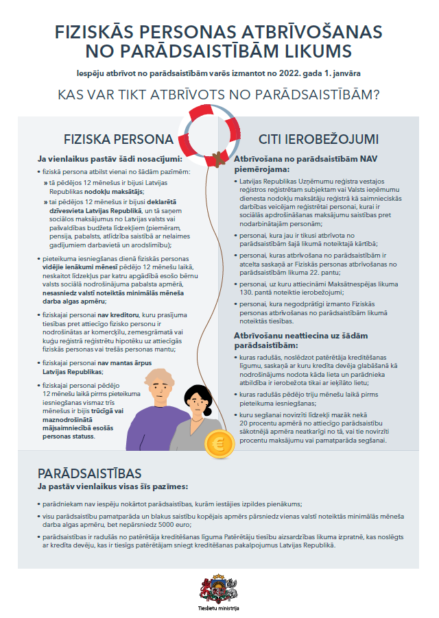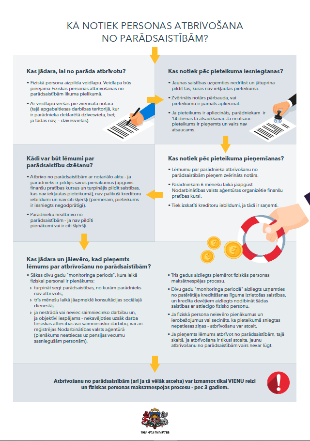 Sīkāku skaidrojumu par nosacījumiem Fiziskās personas atbrīvošanai no parādsaistībām procesa uzsākšanai var uzzināt Tieslietu ministrijas tīmekļvietnē sadaļā “Fiziskās personas atbrīvošana no parādsaistībām” un tīmekļvietnes lvportals.lv rakstā “Parādnieki var sākt izmantot iespēju atbrīvoties no parādsaistībām līdz 5000 eiro“.