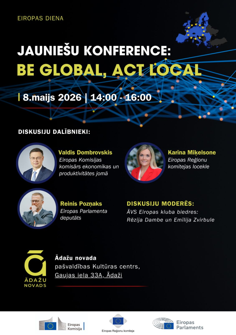Šī gada 8. maijā Ādažu novada Kultūras centrā (Vēstures un mākslas galerijā) norisināsies jauniešiem veltīts pasākums “Be global, Act local”, kura mērķis ir veicināt izpratni par Eiropas Savienības lomu un iedrošināt jauniešus aktīvi iesaistīties sabiedriskajos procesos gan vietējā, gan Eiropas līmenī.